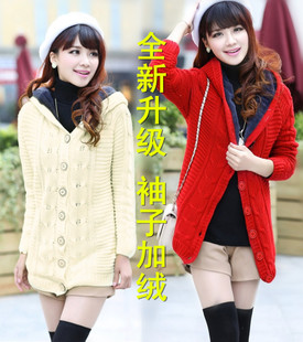 • 韓版帶帽修身保暖全身袖子加絨加厚寬松大碼中長款外套毛衣大衣女 /