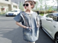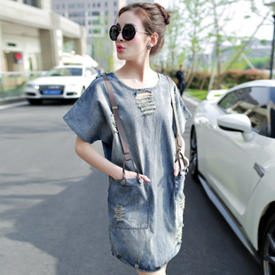 2015夏季新款女牛仔連衣裙夏季圓領(lǐng)短袖背帶休閑破洞磨破牛仔裙女 /