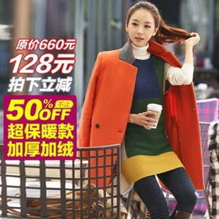 尚客指南韓國代購2014秋冬中長款呢子大衣保暖加厚夾棉毛呢外套女 /