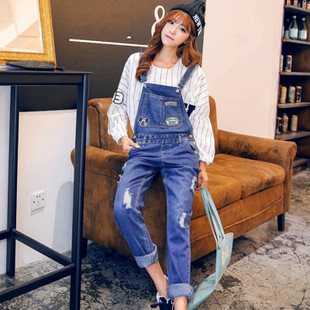 新款2015夏裝韓版徽章破洞牛仔褲女 寬松大碼牛仔背帶褲女潮批發(fā) /
