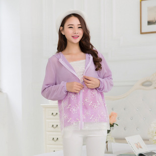 簡(jiǎn)介: 貨號(hào) (4) 產(chǎn)地 杭州 主圖來(lái)源 實(shí)拍有模特 品牌 麥林 貨源類別 現(xiàn)貨 風(fēng)格 韓版 圖案 刺繡 面料 冰絲雪紡料 版型 修身型 組合形式 單件套 厚薄 薄款 衣長(zhǎng) 普通款(50cm<衣長(zhǎng)≤65cm) 袖長(zhǎng) 長(zhǎng)袖 袖型 常規(guī)袖 領(lǐng)型 連帽/帽領(lǐng) 衣門(mén)襟 拉鏈 流行元素 透視,刺繡 上市年份/季節(jié) 2015夏季 顏色 白色,紫色,粉色,天藍(lán)色,藍(lán)配黃色 尺碼 均碼
