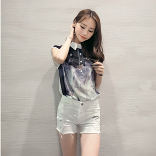 2015韓國東大門女裝夏款翻領(lǐng)印花女式襯衫休閑短袖雪紡衫 /