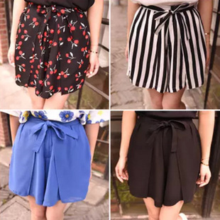 歐美條紋櫻桃印花高腰蝴蝶結(jié)百搭雪紡短褲裙褲 /