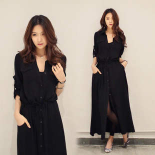 2015春新款韓國SZ女裝時尚大牌長袖翻領(lǐng)單排扣開叉連衣裙長裙 /