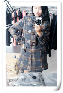 2014年秋冬新款 韓國爆款 學(xué)院風(fēng)格子牛角扣毛呢大衣 原廠跟單 /