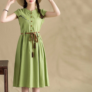 夏季新款女裝 民族風(fēng) 立領(lǐng)修身中長款 棉麻連衣裙 一件起批 /