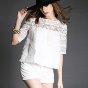 歐洲站夏季女裝新款蕾絲花邊鏤空小香風(fēng)套裝 短袖短褲兩件套 /
