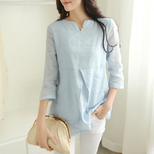 2015上衣棉麻女裝襯衫女 亞麻七分袖V領(lǐng)襯衫 寬松娃娃衫 /