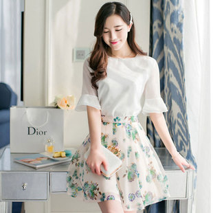嵐色蝶靚2015春夏裝新款韓版 兩件套 歐根紗 印花 雪紡 連衣裙 /