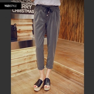 2015夏季休閑褲潮女哈倫褲新品日系豎條紋百搭系帶松緊腰條紋褲8 /