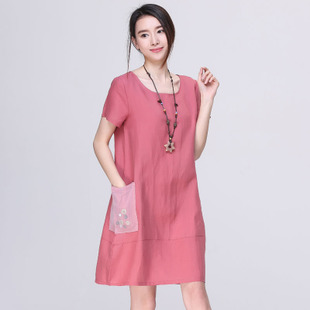 2015夏裝新款女裝布衣寬松顯瘦大口袋韓版圓領(lǐng)短袖棉麻連衣裙 /