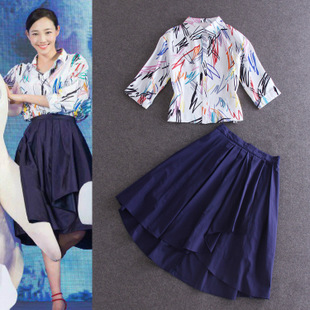 歐洲站 2015夏季新款女裝 白百合同款涂鴉中袖襯衣+百褶半裙套裝 /