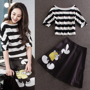 歐洲站 2015夏季新款歐美女裝 張鈞甯同款條紋上衣+米奇半裙套裝 /