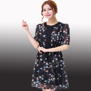 2015夏季韓版大碼寬松女裝雪紡印花連衣裙五分袖 高端定制 /