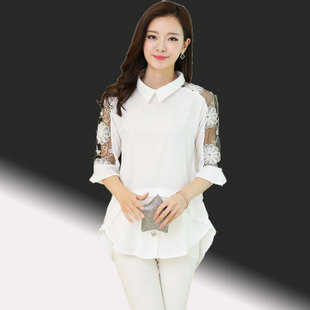 2015韓版寬松女式大碼女裝雪紡上衣 胖MM襯衣領(lǐng)網(wǎng)紗拼接襯衫 /