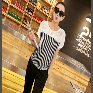 東大門2015夏新款短袖條紋蕾絲衫女 寬松蝙蝠袖拼接黑白T恤打底衫 /