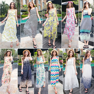 2015夏季無袖碎花雪紡連衣裙波西米亞度假沙灘長裙 /
