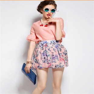 2015歐洲站夏裝新款歐美大牌顯瘦粉色短袖上衣+印花短裙套裝 /