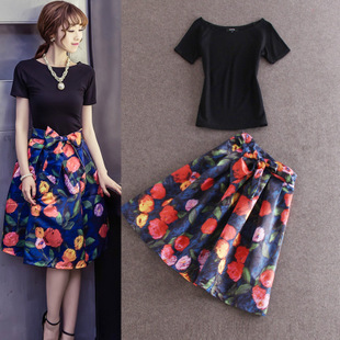 2015夏裝新款 歐洲站時(shí)尚黑色百搭圓領(lǐng)短袖t恤+蝴蝶結(jié)半身裙套裝 /