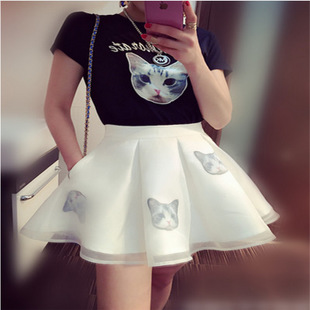 2015夏季歐洲站時(shí)尚貓咪刺繡印花T+歐根紗蓬蓬半身短裙套裝 /