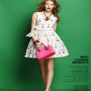 2015夏裝新款 歐洲站名媛印花歐根紗無袖背心連衣裙高腰蓬蓬裙 /