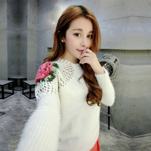 2015韓版手工繡花鏤空肩膀大紅花朵馬海毛寬松針織衫毛衣套頭女裝 /