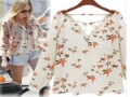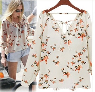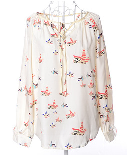 • 春季歐美新款飛鳥襯衫 彩色飛鴿V領(lǐng)百搭系繩 長袖印花大碼雪紡衫 /
