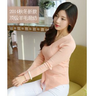 2015秋東大門款交叉低V領(lǐng)糖果色針織打底衫 袖貼身混羊毛上衣 /