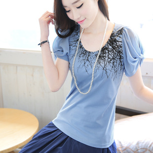 棉立方2015夏裝新款小清新印花雪紡袖T恤休閑白色 t恤女短袖 /