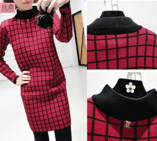 新品春秋韓版女裝拼色格子立領中長款毛衣女套頭女式針織衫打底衫 /