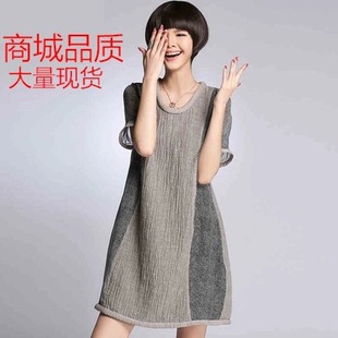 春夏新款歐美風(fēng)真絲亞麻拼接中長款寬松大碼女裝連衣裙 /