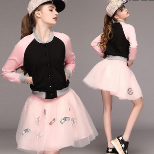 2015歐美早春新款拼色棒球服短款外套+蓬蓬紗貼布刺繡半裙套裝 /