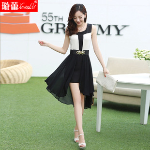 2015夏季韓風(fēng)修身不規(guī)則雪紡長裙背心燕尾連衣裙(送腰帶) /