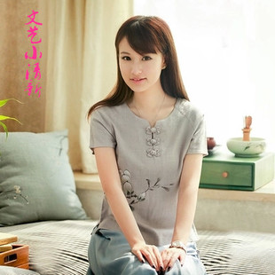 森系原創(chuàng)設(shè)計夏裝亞麻外貿(mào)女裝復(fù)古文藝范寬松女短袖上衣棉麻襯衫 /