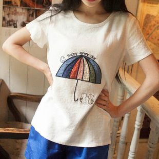 058# 日系森女 小清新七彩雨傘貼布麻棉T恤 短袖女式T恤衫上衣女 /
