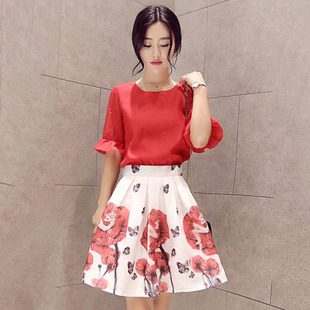 ANLANNA2015歐美夏女裝新品喇叭袖上衣歐根紗碎花半身裙兩件套5碼 /