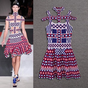 歐洲站2015新款露鎖骨修身多色格子印花高彈力針織打底連衣裙 /