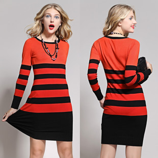 歐洲站2015新款女裝羊絨條紋打底春裝連衣裙 不起球 /