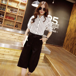 闊腿褲套裝 2015新款條紋雪紡襯衫套裝女修身時尚兩件女裝批發(fā) /