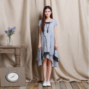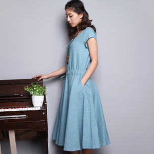 2015夏季純色森系風寬松大碼女裝文藝范抽繩亞棉麻料連衣裙長裙子 /