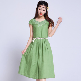 2015夏棉麻連衣裙大碼中長款韓版文藝森系繡花圓領短袖連衣裙批發(fā) /