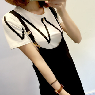 2015夏季新品兩件套連衣裙短袖學院風休閑背帶裙子修身套裝 /