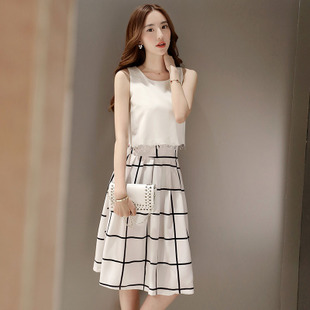 2015夏季新款中長款淑女時(shí)尚寬松圓領(lǐng)無袖格子雪紡連衣裙兩件套裝 /