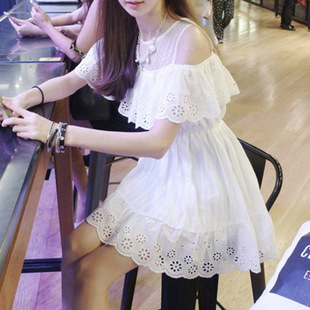 一件代發(fā)東大門韓版女裝夏裝新款棉麻刺繡露肩荷葉邊蕾絲連衣裙夏 /