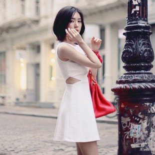 韓版白色修身暗紋無袖A字裙露腰性感鏤空連衣短裙 /