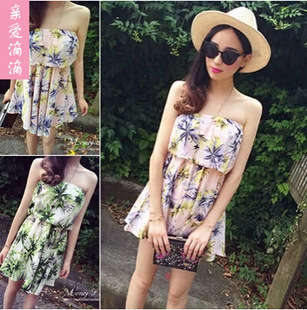 2015夏威夷少女夏日熱帶椰樹印花裹胸收腰連衣裙 /