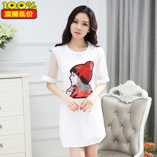 胖MM大碼2015夏季新款女裝 韓版中長款連衣裙短袖網(wǎng)紗顯瘦連衣裙 /