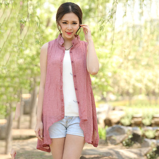 2015夏季新款女裝原創(chuàng)韓版棉麻純色無袖襯衣文藝百搭女式襯衫防曬 /