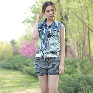 2015夏季新款牛仔襯衫印花襯衫女無袖韓版修身百搭翻領襯衣 /