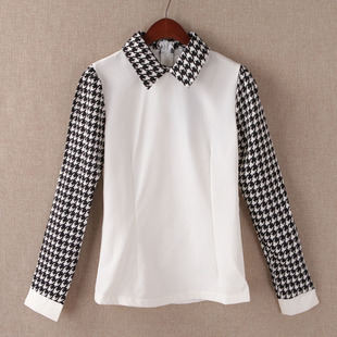 2015時(shí)尚夏季新款撞色千鳥格長(zhǎng)袖套頭襯衫 女 882 /